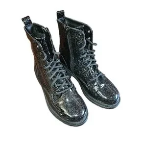 Stylish black combat boots with a glitter finish. Perfect for adding sparkle to any outfit.