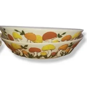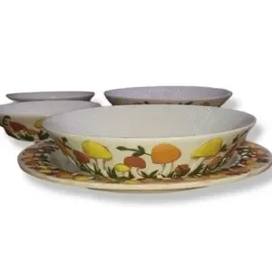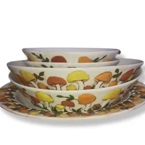 A set of five handmade ceramic dinner plates from the late 1970s by Arnel's. Each round plate features a colorful mushroom pattern and has a diameter of 10.5 inches. The plates are part of a four-piece set and are suitable for all occasions, adding a nostalgic touch to any dining experience with a cottage core aesthetic.