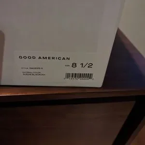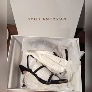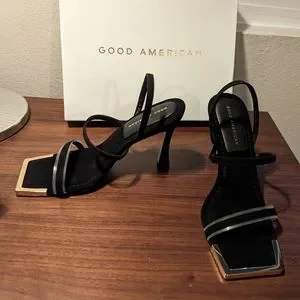 Elevate your shoe game with these sleek and stylish black suede heel sandals from Good American. The square toe and gold accents add a touch of glam to any outfit, while the strappy design and stiletto heel provide a sexy and sophisticated look. These shoes are perfect for a night out or a special occasion and are sure to make a statement.