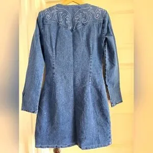 Stylish denim dress with intricate embroidery. Contrast stitching brings Western style to a long-sleeve minidress cut from cotton-blend denim with subtle stretch. Perfect for any occasion.