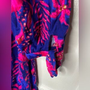 Stay stylish at the beach with this vibrant floral swim cover-up dress. Featuring a beautiful pink and blue design, this dress is perfect for a day in the sun. Enjoy comfort and elegance with its V-neck style. Item #20510481. I only wore this dress one time. I should have bought a smaller size