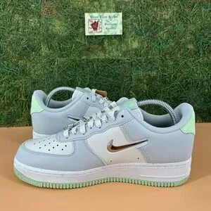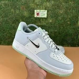 Chic Air Force 1 Low sneakers in light gray and mint green. Features a metallic swoosh logo.
