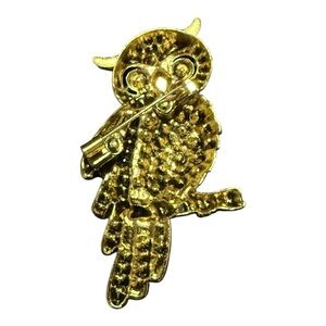 Elegant owl brooch with sparkling green eyes and gold accents. Perfect for adding a touch of whimsy to any outfit.