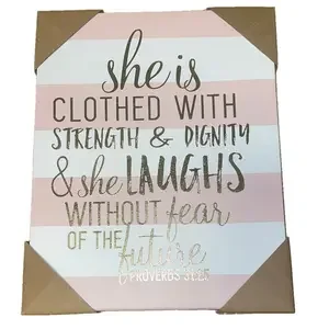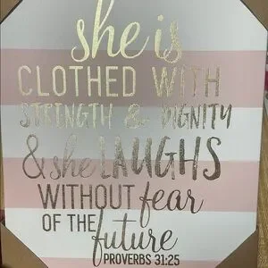 Proverbs 31:25 Pink & White with Gold Writing Canvas Decor