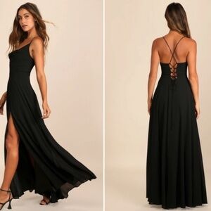 You'll be destined for love in the Lulus Romantically Speaking Black Cowl Lace-Up Maxi Dress! Woven chiffon shapes this stunning dress that has a fitted bodice, cowl neckline, and slender straps that lace down the back and tie at the waist. A high waist tops a maxi skirt with a thigh-high slit at the front. Hidden back zipper/clasp.