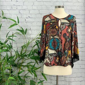 Multicolor Paisley Print Blouse w/ Keyhole Detail in the Front & Back, Butterfly Sleeves and a Wrap Detail in the Front