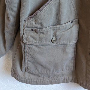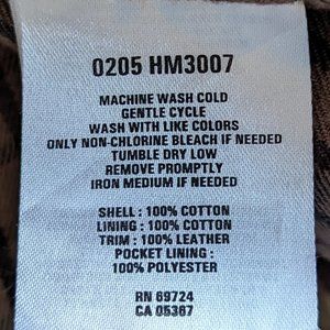 Pre-Owned Condition! Blended Fabrics. Excellent Condition Heavy Multipocketed: Back Map Pocket, 2 Button Down Front Pockets, 4 Top-Down Front Pockets, Snap Cuffs, 100% Cotton Shell, 100% Cotton Lining, 100% Leather Trim. One Inside Velcro Pocket.