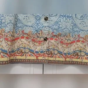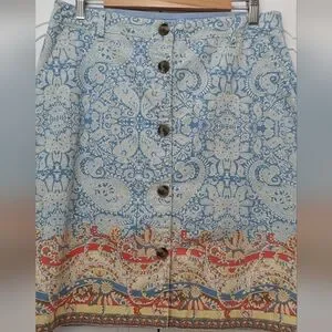 This knee-length A-line skirt from Lands' End showcases a calming blue hue, perfect for casual outings. Its intricate patterns and horizontal border design add a touch of bohemian elegance, making it a versatile choice for relaxed settings. Crafted from a comfortable fabric, it ensures both style and ease of movement.