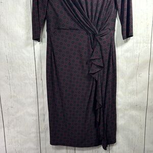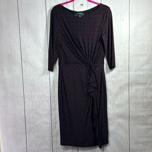 Lauren Ralph Lauren Geometric Knot Ruffle Ruched Black Burgundy 3/4 Sleeves Midi Dress