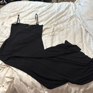 Sleek and stylish black maxi dress with spaghetti straps. Ribbed stretchy material. Runs a bit large in my opinion. Fit me at a size 16-18. Finding a new home now that it no longer fits me. Straps are slightly worn and minor pilling under arms. Easily removed if desired. Straps are adjustable. Worn and washed with care.