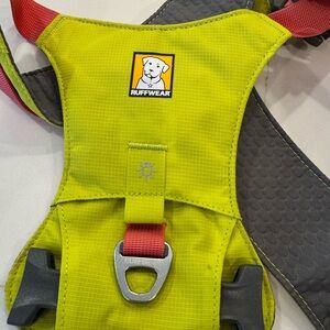 Ruffwear dog harness in vibrant yellow. Features durable design and adjustable straps.