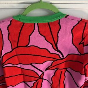 Vibrant sweater with bold floral design. Features red, pink, and green colors. Stretchy. Stains on back shone