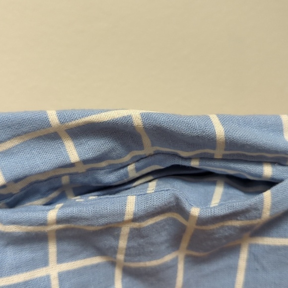 Adjustable shoulder strap, blue and white checkered mini dress in great Preowned condition. Side slant pockets. Lined 100% Cotton. Measurements laying flat; pit to pit 16" Shoulder to hem 30"