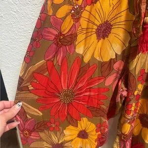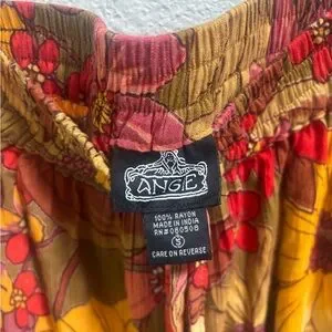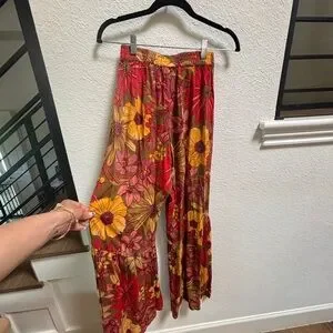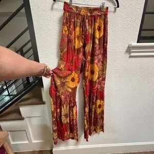 Vibrant floral wide-leg pants with an elastic waistband. Features red, yellow, and brown hues. Very fun bell bottom flares at bottom too.