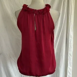 This stunning red (magenta/burgundy) sleeveless, polyester (feels satiny) blouse from WHBM has a 3D floral top. Elastic waistband in the back. Fabric covered buttons and fake rhinestones in the flowers. Couldn’t be more prefect for summer. See pics for measurements. Smoke free home.