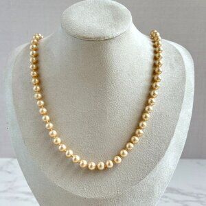 Marvella jewelry is highly collectible for its quality craftsmanship, especially their famous costume pearl necklaces. This strand showcases creamy pearls with a gorgeous soft luster, each bead securely knotted. The secure gold clasp is signed "Marvella," a trusted name in mid-century costume jewelry.