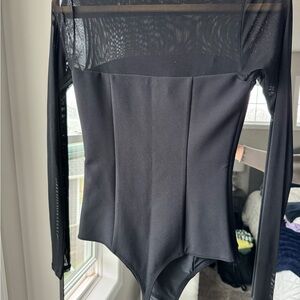 This sleek black bodysuit from Abercrombie & Fitch features an asymmetrical design that hugs the body for a flattering fit. The elegant construction combines a solid black fabric with a delicate mesh panel, creating a sophisticated contrast. Perfect for adding a touch of modern style to any outfit.