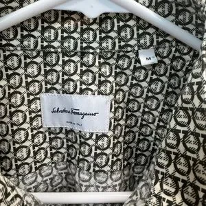 Elevate your wardrobe with this Salvatore Ferragamo men’s button-down shirt, featuring the brand’s signature Gancini logo print throughout. Crafted in 100% cotton and made in Italy, this luxury designer shirt is perfect for both formal and casual styling. The black-and-white geometric pattern adds a sleek, modern touch.