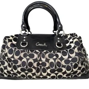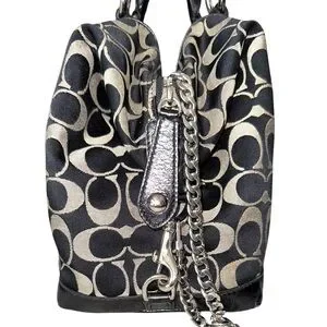 This gorgeous and new looking bag is by Coach. She is EUC though. This is a Coach Ashley Signature Sateen three-way Satchel Bag. It is black and gray with a canvas/leather material. This bag has beautiful rolled handles, a secure ziptop closure, footed leather bottom, heavy duty, silver hardware, and a medium sized three sections on the inside. This beautiful bag will come in an unbranded dust bag to secure it. You get the chain that is pictured and the adjustable strap is included.