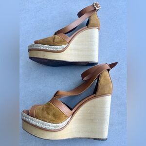 Hermes Tan Suede and Leather Wooden Wedge Ibiza Sandals size 38