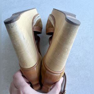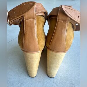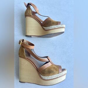 Hermes Tan Suede and Leather Wooden Wedge Ibiza Sandals size 38. In fair pre owned condition.