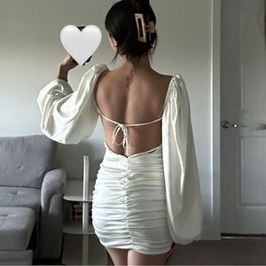 LIKE NEW! OH POLLY! ELEGANT WHITE SATIN PUFF LONG SLEEVE BODY CON MINI DRESS!