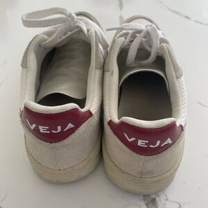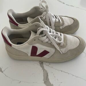 Stylish Veja sneakers with a white mesh upper and red accents. Comfortable and trendy design.