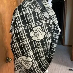 Black and Cream Plaid Shawl with Camelia floral Design