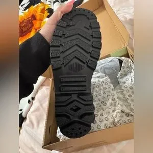 Stylish black high-top boots by Palladium. Features a rugged sole and lace-up design. Perfect for casual wear.