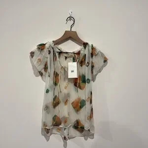 Self: 100% silk Made in China Dry clean only Tie detail at neckline Flutter sleeves Lightweight chiffon fabric Garment is made with a semi-sheer fabric, undergarments can show through