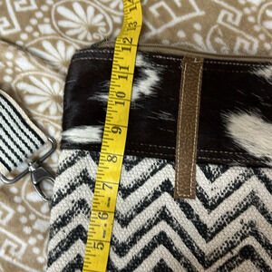 This Myra brand crossbody bag is a stylish addition to any woman's wardrobe. The bag features an exterior made of animal hair, giving it a unique and trendy look. It is perfect for carrying all your essentials and is ideal for women on the go. The bag is designed with a comfortable strap for easy carrying and is suitable for any occasion. Preowned with possible flaws none visible