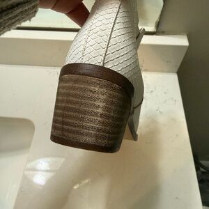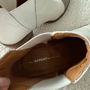 These Report ankle booties showcase a sleek two-tone design with a white body and a contrasting gray toe cap. Crafted from a textured material, they offer a modern slip-on style with a pointed toe for a chic look. Perfect for adding a touch of elegance to any outfit.