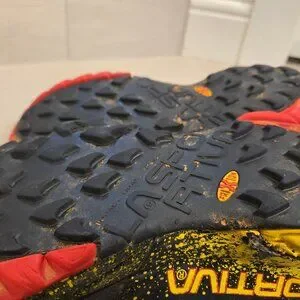 Light used La Sportiva Akasha trailrunners. I put less than 100 miles on these before realizing my foot shape needed a different shoe. Tread is in excellent shape, some small costmetic separating of the graphic on each side near the arch, see photos for closeup.