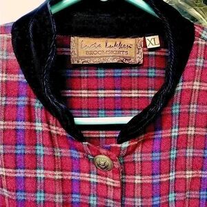Vintage 80’s - Y2K awesomeness by Lucia Lukken Broomskirts! Super soft cranberry red plaid 100% cotton flannel with black velvet banded collar. Brass tone engraved buttons adds military detail. Princess seams down front and back for a feminine silhouette. And wait for it….. flannel covered shoulder pads! This is a rare and special find. She was my favorite, but is a little too snug now. Hope you’ll love her as much as I have. Misses XL. Shaped, not boxy fit. Non-smoker, fast ship. One available.