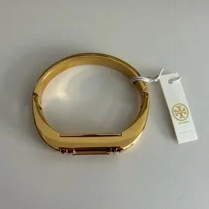 Elegant gold bangle bracelet by Tory Burch. Can be worn on its own or with a Fitbit installed. Features a sleek design with a secure hidden clasp. New, never used, perfect condition. Stunning!