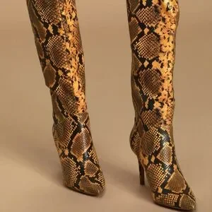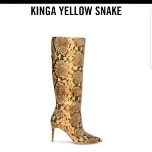 Sleek, black and yellow snake embossed vegan leather shapes these show stopping boots that feature a classic pointed-toe upper, knee-high shaft, and a sexy stiletto heel!