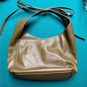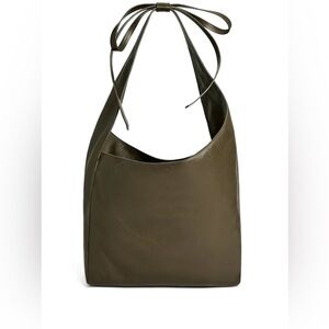 A slouchy tote with a magnetic closure, features a decorative tie detail, and inside zip pocket with a card holder.