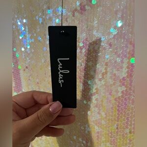 NWT! Lulu’s white sequin iridescent, mini dress with adjustable straps. XL. BRIDES!! this is the perfect dress for your bachelorette party. The sequence gives off a subtle pink and lavender tone, it also has a beautiful net neck line and scoops down in the back. Last photo is of the full back of the dress. Pit to pit is 21.5”. Pit to hem is 25”.