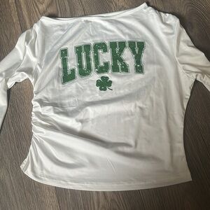 This stylish long sleeve tee from SHEIN features an asymmetrical off-the-shoulder design, accentuated by a vibrant green 'LUCKY' print and a charming shamrock motif. Crafted from a soft, stretchy fabric, it offers a comfortable and flattering fit, perfect for adding a touch of flair to your casual wardrobe.