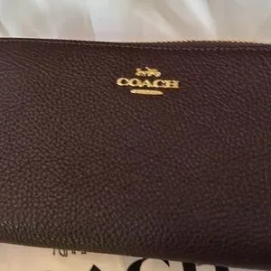 Elegant Oxblood leather wallet by Coach. Features a sleek design with gold accents.