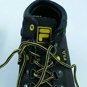 Sport a tough look with the Fila Boot. It has a lace-up closure for a strong and secure fit. The sturdy design ensures a snug fit and keeps your foot comfortable. This shoe has a thick out sole with excellent traction and good grip. It has a padded collar for cushioned comfort. Logos on the tongue, sides and back ensure authenticity. Like new.