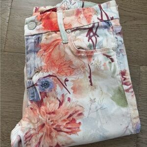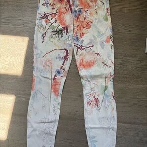 Ivory Stretch Denim witl Mulrti Coloured Floral Design. Stretch. Classic 5 Pocket style. Mid Rise. Skinny Tapered leg.