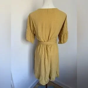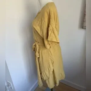 Stylish mustard yellow wrap dress with short sleeves. Perfect for casual outings.