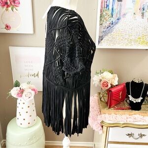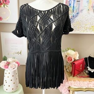 This chic black top from Buckle showcases a unique cut-out design and short sleeves, perfect for a stylish look. The intricate geometric beading on the bodice adds a touch of elegance, while the flowing fringe detail starting at the waist enhances movement and vintage charm.