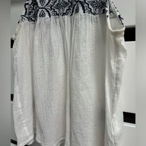 Super cute Flowy white and navy halter tank - embroidered on the front ant the back, buttons at the back of the neck and created a keyhole