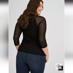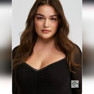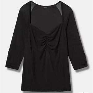 This sleek black blouse from Torrid features a ruched design that enhances its fitted silhouette. The solid black color and classic style make it a versatile choice for both casual and dressier occasions.