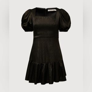 This elegant black dress features stylish puff sleeves and a flattering silhouette. Perfect for any occasion, it combines comfort with chic design. Offered in metallic chiffon this puff-sleeve mini dress is set off with ruffles and picot trim along the neckline. It’s fully lined everywhere but the sleeves, and falls to a tiered skirt with shirring. A zip details the center back.