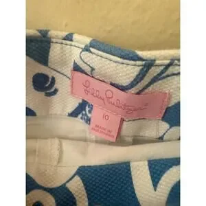 Lilly Pulitzer mini skirt, size 10. Blue and white pattern with white border wrap crossover. Small mark on the skirt (pictured). Shorts underneath the skirt (attached).
