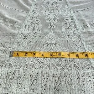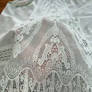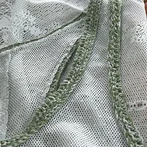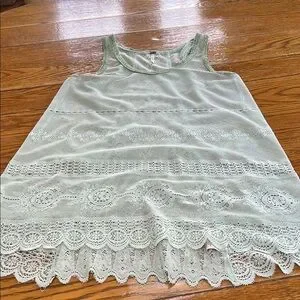 Free People sheer lace racerback tank top. Scalloped hemline is slight longer in back. Sheer crochet lace with floral details. Mint green color with green crochet stitch on edges of neckline and armpits. Excellent used condition. Size Medium.