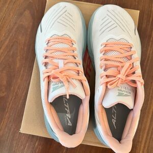 Like new-only worn a few times. Experience unparalleled comfort and support with Altra's athletic shoes, crafted in a vibrant white and pink design. Perfect for any athletic endeavor, these shoes combine style and functionality to enhance your performance. Elevate your workout with footwear that prioritizes both aesthetics and efficiency.